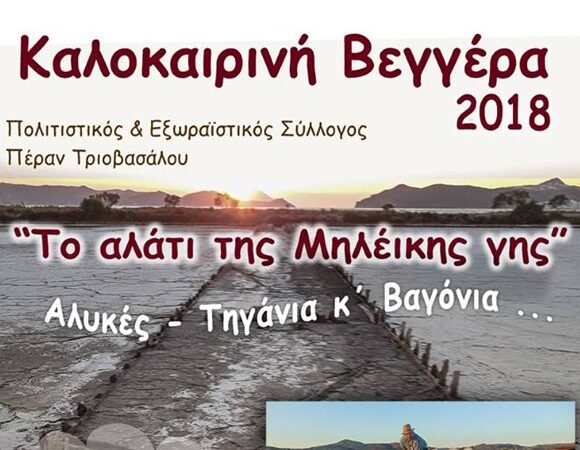 Μετά τη λήξη του τριήμερου πένθους θα πραγματοποιηθεί κανονικά η εκδήλωση του Πολιτιστικού και Εξωραϊστικού σύλλογου Πέρα Τριοβασάλου η Καλοκαιρινή Βεγγέρα 2018 “Το αλάτι της Μηλέϊκης γης” το Σάββατο 28 Ιουλίου στις 9 το βράδυ στην παιδική χαρά του Π. Τριοβασάλου. Ζωντανή Περισσότερα