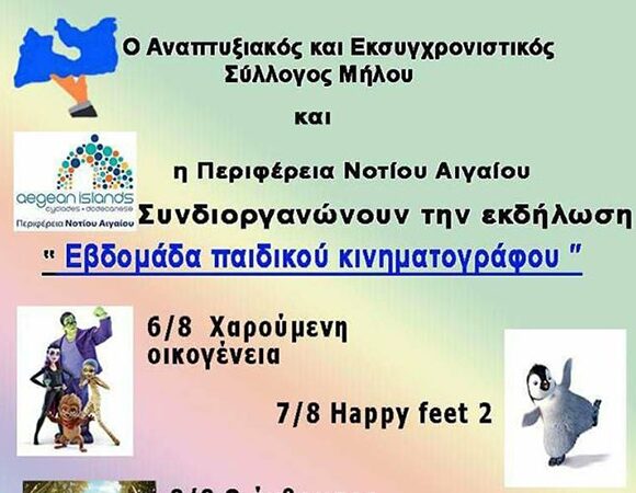 Εκδήλωση εβδομάδας παιδικού κινηματογράφου διοργανώνουν ο Αναπτυξιακός και Εκσυγχρονιστικός Σύλλογος Μήλου , με την Περιφέρεια Νοτίου Αιγαίου. Οι παραστάσεις ξεκινάνε από την Δευτέρα 6 Αυγούστου στο Συνεδριακό Κέντρο Μήλου “Γ. Ηλιόπουλος” (εξωτερικός χώρος) στις Περισσότερα