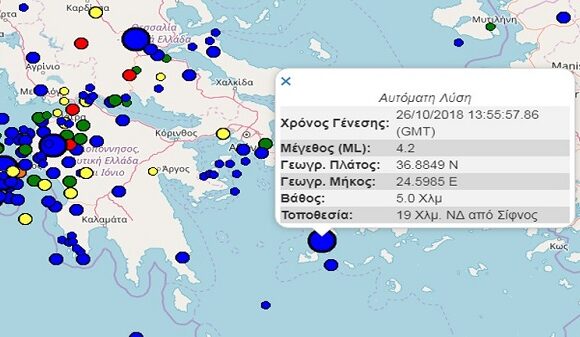 Ισχυρή σεισμική δόνηση σημειώθηκε το μεσημέρι της Παρασκευής στη Σίφνο. Ο σεισμός ήταν μεγέθους 4,2 Ρίχτερ σύμφωνα με τη μέτρηση του Γεωδυναμικού Ινστιτούτου. Το επίκεντρό του βρισκόταν 19 χιλιόμετρα νοτιοδυτικά της Σίφνου και είχε εστιακό βάθος πέντε χιλιόμετρα.Περισσότερα