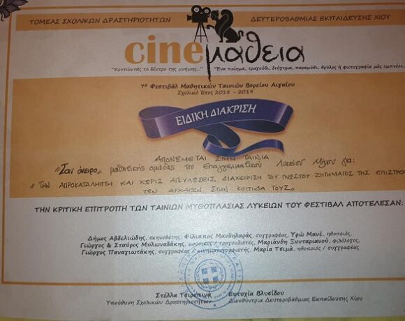 Ειδική Διάκριση για “Την απροκατάληπτη και χωρίς αγκυλώσεις διαχείριση του γνωστού ζητήματος της επιστροφής των Αρχαίων στην κοιτίδα τους ” έλαβε η μαθητική ταινία του ΕΠΑ.Λ Μήλου με τίτλο “Σαν όνειρο”, στο 7ο Φεστιβάλ μαθητικών ταινιών Cineμάθεια Περισσότερα