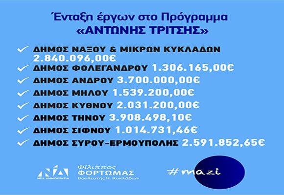 Τα συγχαρητήριά του εξέφρασε ο βουλευτής Κυκλάδων της Νέας Δημοκρατίας κ. Φίλιππος Φόρτωμας, για την ένταξη έργων ύψους 18.895.743,21 εκ., ευρώ στο πρόγραμμα «ΑΝΤΩΝΗΣ ΤΡΙΤΣΗΣ» που πέτυχαν οι Δήμοι Άνδρου, Τήνου, Φολεγάνδρου, Μήλου, Κύθνου, Σίφνου, Ερμούπολης και Νάξου & Περισσότερα