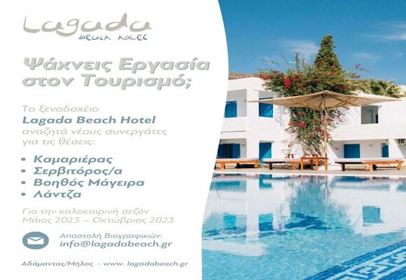 Προσωπικό αναζητά το ξενοδοχείο Lagada beach, για τις θέσεις Καμαριέρας ,Σερβιτόρου/α Βοηθός μάγειρα και Λάντζα, για την περίοδο από Μάιο έως Οκτώβριο 2023. Πληροφορίες email : info@lagadabeach.grΠερισσότερα