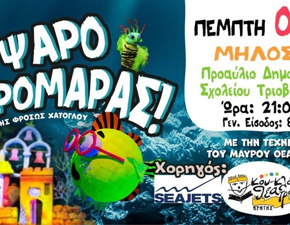 Το Κουκλοθέατρο Κρήτης παρουσιάζει την παραγωγή του “Ο Ψαροτρομάρας“! την Πέμπτη 4 Ιουλίου στο προαύλιο του Δημοτικό Σχολείου Τριοβασάλου για μία παράσταση , στις 21:00 το βράδυ. Γενική είσοδος 8 ευρώ. Με την υποστήριξη του Συλλόγου Γονέων Δημοτικού Σχολείου Μήλου. Περισσότερα