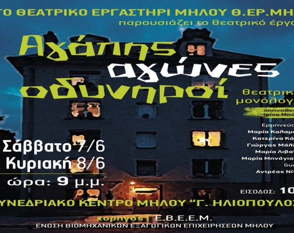Το Θεατρικό Εργαστήρι Μήλου (ΘΕ.Ρ.ΜΗ) παρουσιάζει την παράσταση “ΑΓΑΠΗΣ ΑΓΩΝΕΣ ΟΔΥΝΗΡΟΙ” σε σκηνοθεσία της Ιρίνα Μπόικο. Το έργο αποτελείται από διασκευή των θεατρικών μονολόγων των συγγραφέων : – Ζαν Κοκτώ: «Ανθρώπινη Φωνή» και «Ο Ωραίος Αδιάφορος» – Ιάκωβου Περισσότερα
