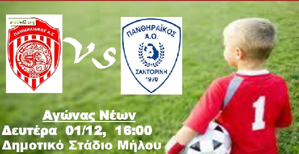 Την Δευτέρα 1 Δεκεμβρίου και ώρα 16.00 στο Δημοτικό στάδιο Μήλου θα διεξαχθεί ο αγώνας νέων μεταξώ Παμμηλιακού και Πανθηραικού.