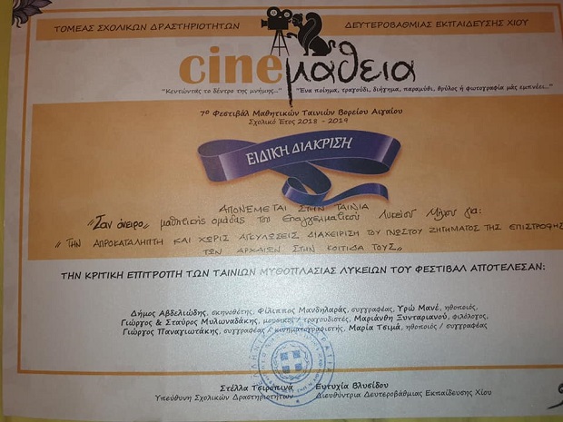 Ειδική Διάκριση για “Την απροκατάληπτη και χωρίς αγκυλώσεις διαχείριση του γνωστού ζητήματος της επιστροφής των Αρχαίων στην κοιτίδα τους ” έλαβε η μαθητική ταινία του ΕΠΑ.Λ Μήλου με τίτλο “Σαν όνειρο”, στο 7ο Φεστιβάλ μαθητικών ταινιών Cineμάθεια 2018-2019.