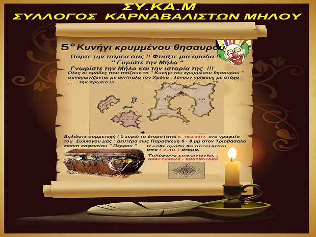 Δηλώσεις συμμετοχής για το “Κυνήγι του κρυμμένου θησαυρού” από 6-18 Φεβρουαρίου 2017 ( 5 ευρώ ) το άτομο στο γραφείο του συλλόγου στον Τριοβάσαλο έναντι καφενείου “Πέρρου”από Δευτέρα – Παρασκευή 6 – 8 μμ. Η κάθε ομάδα θα αποτελείται από ( 2- 10 ) άτομα.