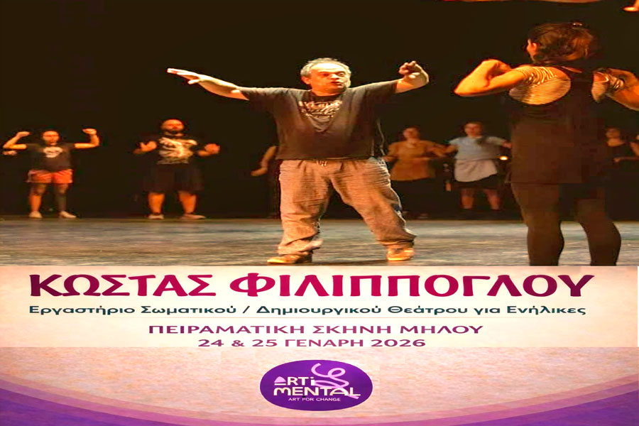 Η ArtiMental σε συνεργασία με την Πειραματική Σκηνή Μήλου, διοργανώνει διήμερο Εργαστήριο Σωματικού – Δημιουργικού Θεάτρου για ενήλικες το Σάββατο 24 και την Κυριακή 25/1/2026 στην Πειραματική Σκηνή Μήλου στον Αδάμαντα.
