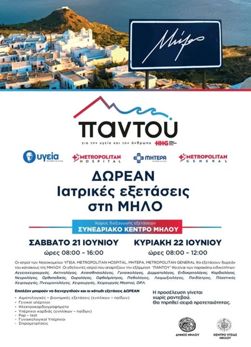Το Πρόγραμμα “ΠΑΝΤΟΥ” θα βρίσκεται στη Μήλο το Σάββατο 21 και την Κυριακή 22 Ιουνίου στο Συνεδριακό Κέντρο Μήλου και θα προσφέρει δωρεάν ιατρικές εξετάσεις και διαγνωστικές υπηρεσίες στους κατοίκους της Μήλου.