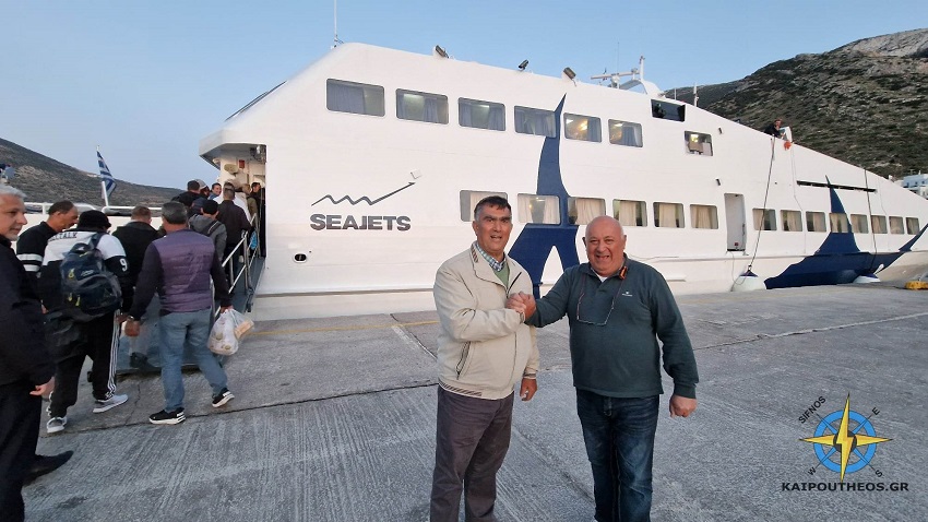 Ο Υποδιευθυντής του ΕΠΑΛ Μήλου κος Βασίλης Μωραϊτης με τον κεντρικό πράκτορα της seajets στη Σίφνο κο Γεώργιο Ποδότα