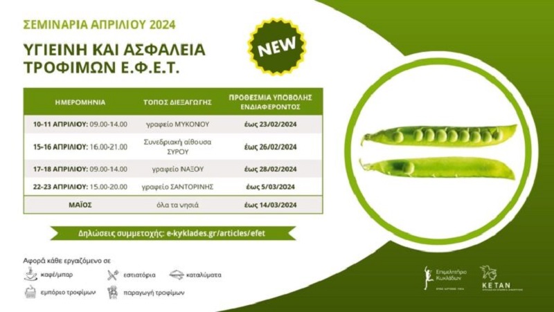 Tο Επιμελητήριο Κυκλάδων ανακοινώνει τη διεξαγωγή σεμιναρίων Υγιεινής & Ασφάλειας Τροφίμων (Ε.Φ.Ε.Τ.) για Απρίλιο και Μάιο 2024.