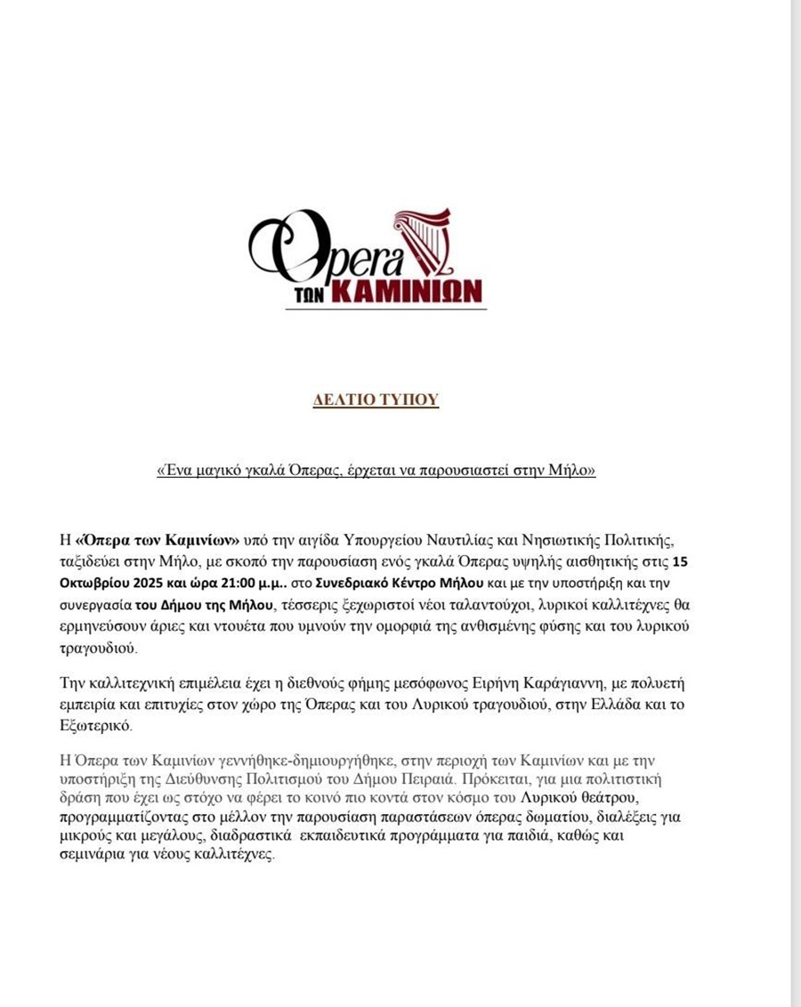 Η Μαγεία της Όπερας στην Καρδιά των Καμινίων. Ένα Μοναδικό Γκαλά «H Όπερα των Καμινίων» την Τετάρτη 15 Οκτωβρίου στο Συνεδριακό Κέντρο Μήλου.