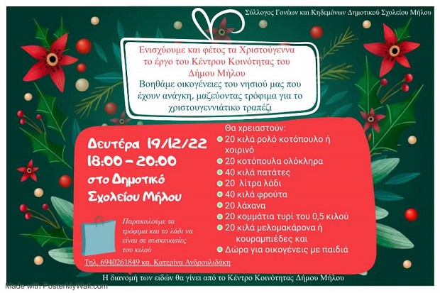 Ο Σύλλογος Γονέων και Κηδεμόνων του Δημοτικού Σχολείου Μήλου, όπως κάθε χρόνο τα τελευταία χρόνια, σας προσκαλεί να ενισχύσουμε όλοι μαζί και φέτος το κοινωνικό έργο του Κέντρου Κοινότητας, προσφέροντας τρόφιμα για το χριστουγεννιάτικο τραπέζι σε οικογένειες του νησιού μας που βρίσκονται σε ανάγκη.