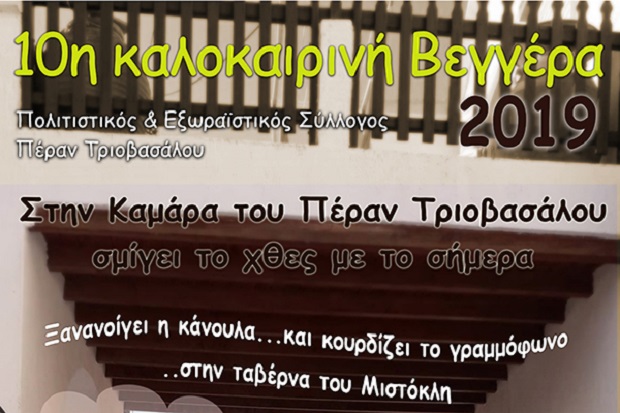 Ο Πολιτιστικός και Εξωραϊστικός Σύλλογος Πέρα Τριοβασάλου διοργανώνει την  “Καλοκαιρινή Βεγγέρα 2019” στην παιδική χαρά του Πέρα Τριοβασάλου  το Σάββατο 27 Ιουλίου στις 21.00  με ζωντανή μουσική. Όλοι στην Περατριοβασαλινή Βεγγέρα !