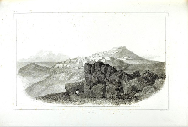 Απεικόνιση του αρχαίου θεάτρου της Μήλου και του οικισμού Πλάκα όπως αποτυπώθηκαν το 1838 στο βιβλίο :