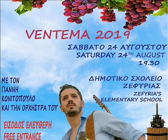 Ο Εξωραϊστικός και Πολιτιστικός Σύλλογος Ζεφυρίας “Η ΧΩΡΑ” διοργανώνει την “Βεντέμα” 2019 , το Σάββατο 24 Αυγούστου στις 19.30 στο Δημοτικό σχολείο Ζεφυρίας. Θα ακολουθήσει νησιώτικο γλέντι με τον Γιάννη Κονιτόπουλο και την ορχήτρα του .