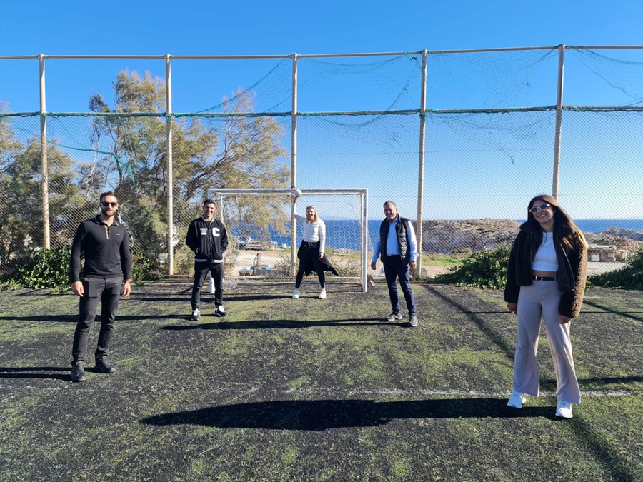 Συζήτησε με όλους για τις ανάγκες και τις προοπτικές ανάπτυξης των αθλητικών υποδομών στο νησί. Επισκέφθηκε  το γήπεδο ποδοσφαίρου 5χ5  του νησιού που δυστυχώς βρίσκεται σε δραματική κατάσταση.
