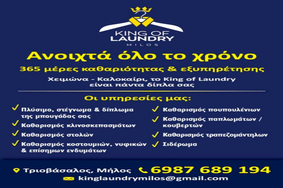 Το καθαριστήριο Ιματισμού King of Laundry στον Τριοβάσαλο παραμένει ανοιχτά όλο το χρόνο.