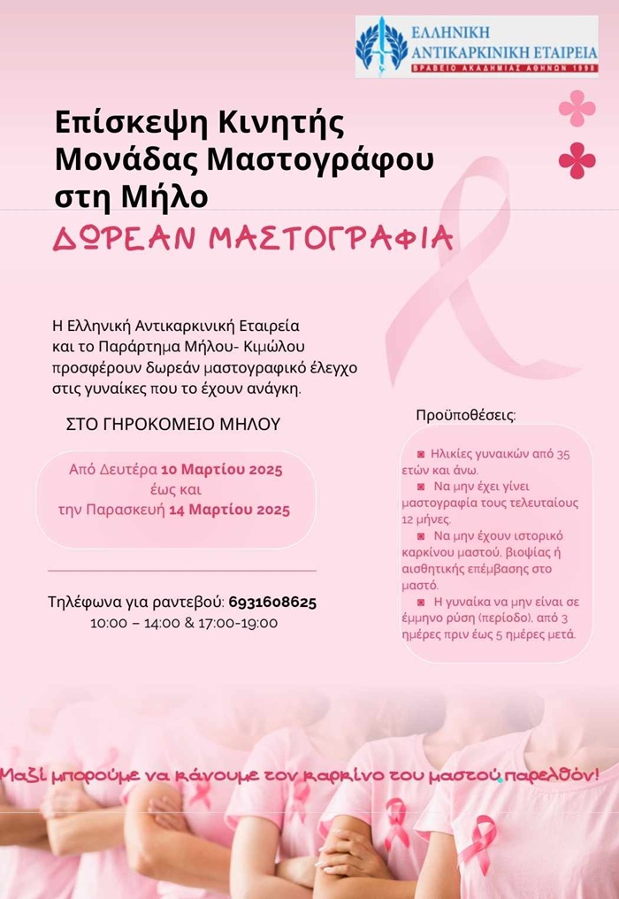 συνεχίζοντας το «πρόγραμμα ευαισθητοποίησης και έγκαιρης διάγνωσης του καρκίνου του μαστού», θα βρίσκεται από Δευτέρα 10 έως και Παρασκευή 14 Μαρτίου 2025 στο Δήμο Μήλου .