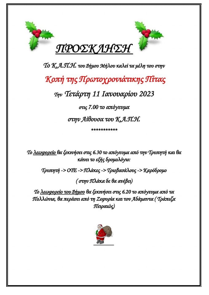 Την πρωτοχρονιάτικη πίτα τους θα κόψουν τα μέλη του ΚΑΠΗ Δήμου Μήλου την Τετάρτη 11 Ιανουαρίου στις 7  το απόγευμα στην αίθουσα του ΚΑΠΗ .