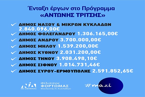 Τα συγχαρητήριά του εξέφρασε ο βουλευτής Κυκλάδων της Νέας Δημοκρατίας κ. Φίλιππος Φόρτωμας, για την ένταξη έργων ύψους 18.895.743,21 εκ., ευρώ στο πρόγραμμα «ΑΝΤΩΝΗΣ ΤΡΙΤΣΗΣ» που πέτυχαν οι Δήμοι Άνδρου, Τήνου, Φολεγάνδρου, Μήλου, Κύθνου, Σίφνου, Ερμούπολης και Νάξου & Μικρών Κυκλάδων, σε συνεργασία με το Υπουργείο Εσωτερικών και ειδικότερα με τον Αναπληρωτή Υπουργό Εσωτερικών, κ. Στέλιο Πέτσα.