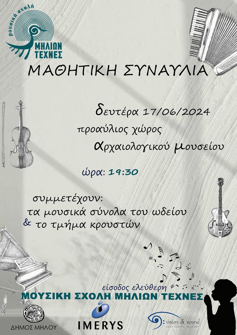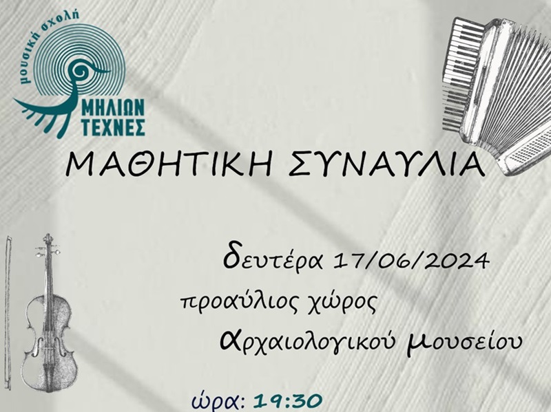 Η Μουσική Σχολή Μήλου (Μηλίων Τέχνες) διοργανώνει την Δευτέρα 17 Ιουνίου ,Μαθητική Συναυλία στον προαύλιο χώρο του αρχαιολογικού μουσείου Πλάκας.