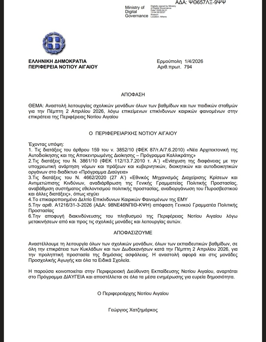 Με ανακοίνωση του ο Δήμος Μήλου ενημερώνει τους πολίτες ότι, σύμφωνα με τη νεότερη υπ’ αριθ. 794/01.04.2026 απόφαση του Περιφερειάρχη Νοτίου Αιγαίου, και λόγω συνεχιζόμενων επικίνδυνων καιρικών φαινομένων, την Πέμπτη 2 Απριλίου 2026: