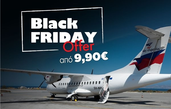Η Sky Express, η αεροπορική εταιρεία με το μεγαλύτερο δίκτυο εσωτερικού, συμμετέχει στη …γιορτή του καταναλωτή και αυτή την Black Friday και προσφέρει 23.000 θέσεις από 9,90 ευρώ! Η προσφορά ισχύει για κρατήσεις που θα πραγματοποιηθούν αύριο Παρασκευή 23 Νοεμβρίου και θα αφορούν πτήσεις που θα πραγματοποιηθούν από 1 Δεκεμβρίου 2018 έως και 31 Μαΐου 2019.