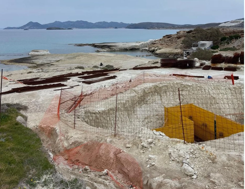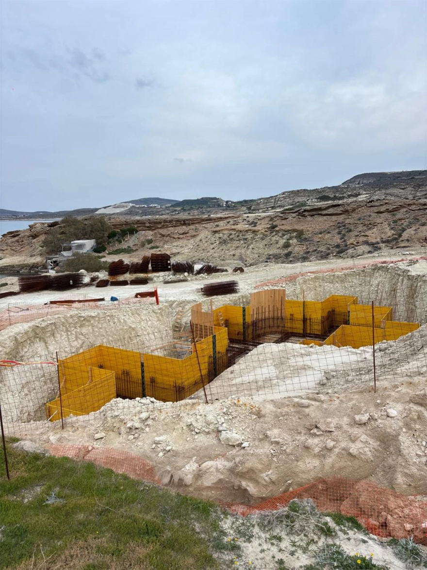 Όπως φαίνεται στις τις φωτογραφίες που τραβήχτηκαν την Κυριακή 2/3 και φέρνει στη δημοσιότητα το protothema.gr, η μεγάλη τρύπα που άνοιξαν για να ρίξουν τα θεμέλια του ξενοδοχείου-εκτρώματος παραμένει σε απόσταση αναπνοής από τη διάσημη παραλία της Μήλου.