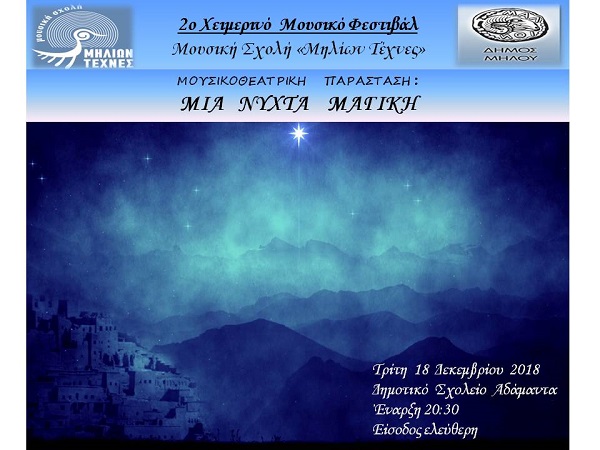 Η Μουσική σχολή Μήλου “Μηλίων Τέχνες” με την συμμετοχή της εφηβικής χορωδίας, το γκρουπ του Νίκου Χατζηγιάννη , τους μαθητές κρουστών του κ. Γιώργου Κατσίκα και την Φιλική συμμετοχή το μουσικό σύνολο του κ.Κώστα Συμεωνίδη παρουσιάζουν την μουσικοθεατρική παράσταση ” Μία νύχτα μαγική” στο Δημοτικό σχολείο Αδάμαντα την Τρίτη 18 Δεκεμβρίου στις 20.30.
