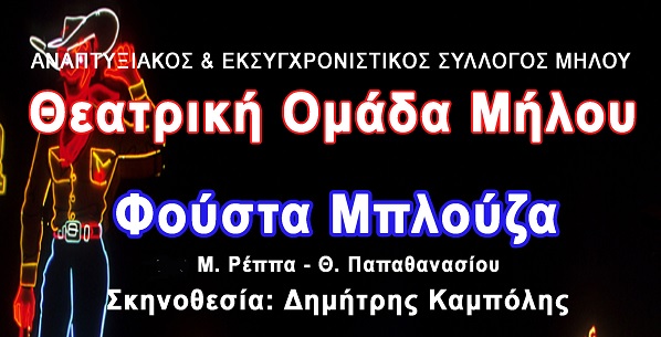 Οι νέες παραστάσεις της Θεατρικής Ομάδας Μήλου με το έργο ” Φούστα μπλούζα ” θα γίνουν το Σαββάτο και την Κυριακή 21 και 22 Ιουνίου στο Συνεδριακό Κέντρο Μήλου Γ. Ηλιόπουλος.