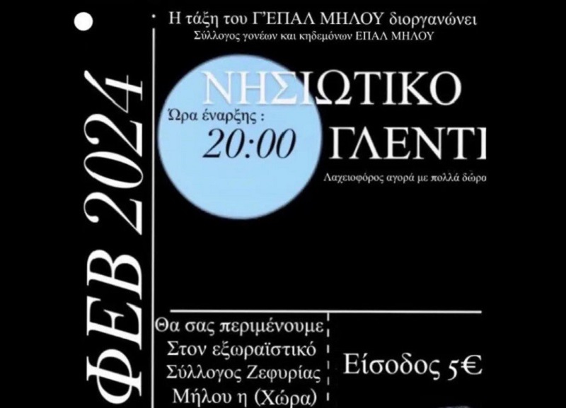 Το Σάββατο 3 Φεβρουαρίου η τάξη Γ’ ΕΠΑ.Λ Μήλου και ο Σύλλογος γονέων και Κηδεμόνων διοργανώνουν νησιώτικο γλέντι στην αίθουσα του Εξωραϊστικού Συλλόγου της Ζεφυρίας.