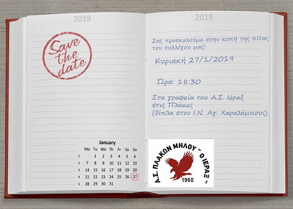 Την πρωτοχρονιάτικη πίτα θα κόψει ο Αθλητικός Σύλλογος “ΙΕΡΑΞ” στα γραφεία του συλλόγου στις Πλάκες ,την Κυριακή 27 Ιανουαρίου στις 18.30.