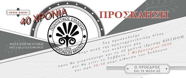 Το Σάββατο 1 Φεβρουαρίου ο Πολιτιστικός Σύλλογος Πολλωνίων Μήλου κόβει την πρωτοχρονιάτικη πίτα στην αίθουσα του συλλόγου στις 20.30 και γιορτάζει τα 40 χρόνια από την ίδρυση του.