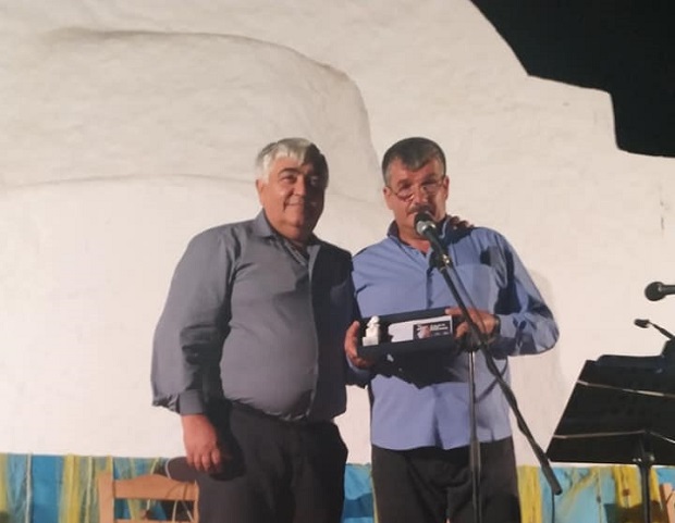 Ο Πρόεδρος του Εξωραϊστικού Συλλόγου Μανδρακίων κ. Αντώνιος Καβαλιέρος ευχαριστεί τον Δήμαρχο Μήλου κ. Γεράσιμο Δαμουλάκη για την τιμητική πλακέτα που του απέδωσε στην εκδήλωση “ΘΑΛΑΣΣΙΝΑ ΦΕΓΓΑΡΙΑ” σε αναγνώριση της προσφοράς του έργου του.