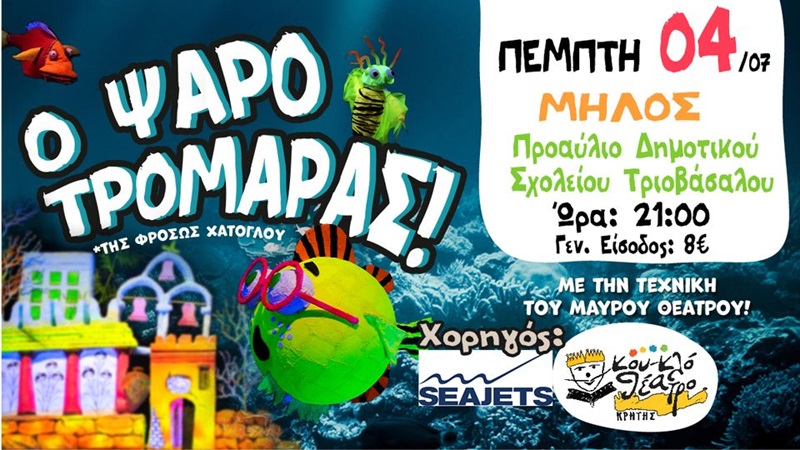 Το Κουκλοθέατρο Κρήτης παρουσιάζει την παραγωγή του “Ο Ψαροτρομάρας“! την Πέμπτη 4 Ιουλίου στο προαύλιο του Δημοτικό Σχολείου Τριοβασάλου για μία παράσταση , στις 21:00 το βράδυ.