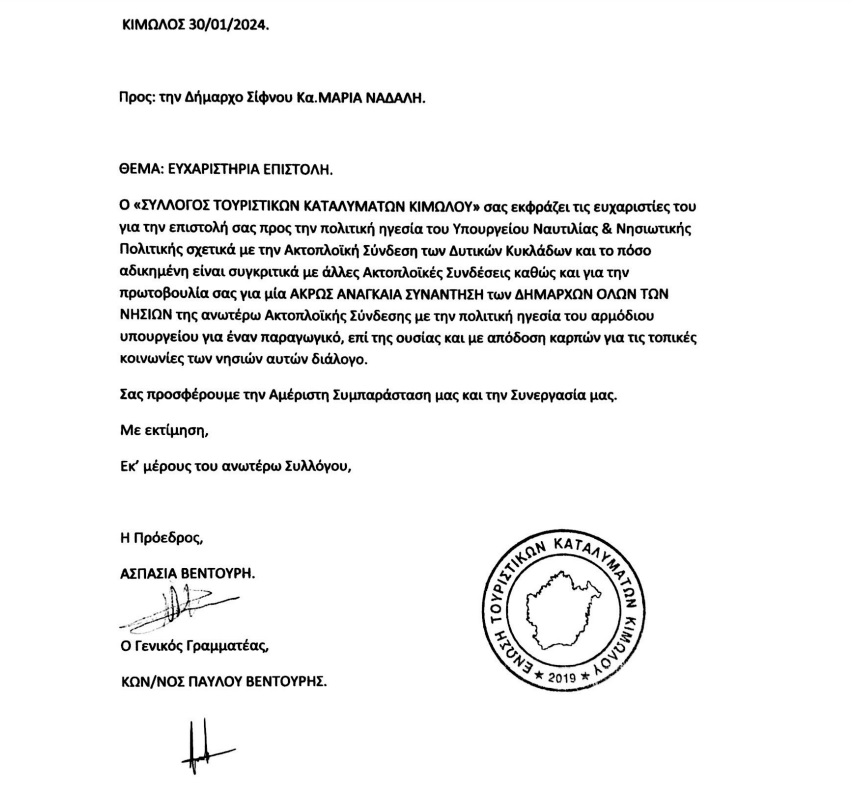 Με επιστολή προς την Δήμαρχο Σίφνου κα. Ναδάλη ο Σύλλογος Τουριστικών Καταλυμάτων ευχαριστεί την Δήμαρχο για την επιστολή προς το Υπουργείο Ναυτιλίας σχετικά με τη βελτιστοποίηση της ακτοπλοϊκής σύνδεσης των Δυτικών Κυκλάδων. Ακολουθεί η επιστολή :