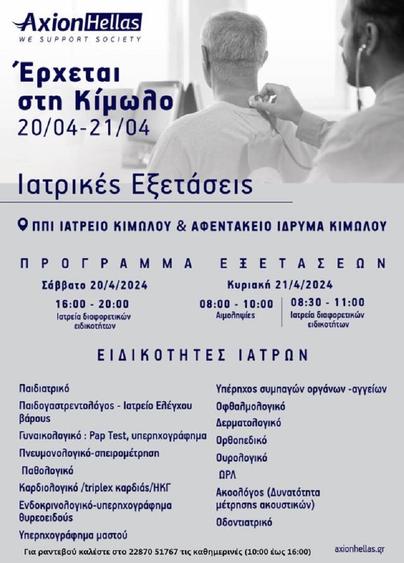 H AXION HELLAS στο διάπλου της 16ης δράσης, σε συνεργασία με τον Δήμο Κιμώλου, θα πραγματοποιήσει δωρεάν ιατρικές εξετάσεις και ποικίλες Εκπαιδευτικές –Πολιτιστικές εκδηλώσεις , το Σάββατο 20 Απριλίου έως την Κυριακή 21 Απριλίου 2024.