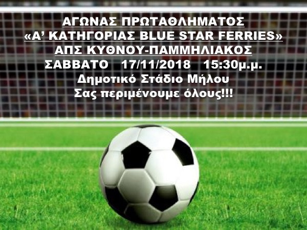Στο Δημοτικό Στάδιο Μήλου την Κυριακή 17 Νοεμβρίου στις 15.30 θα διεξαχθεί ο ποδοσφαιρικός αγώνας Α.Π.Σ Κύθνου και Παμμηλιακού.