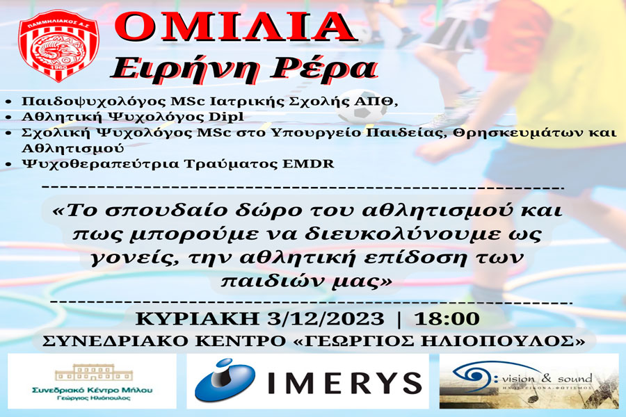 Ο Παμμηλιακός Α.Σ. διοργανώνει ομιλία με θέμα: «Το σπουδαίο δώρο του αθλητισμού και πως μπορούμε να διευκολύνουμε ως γονείς, την αθλητική επίδοση των παιδιών μας» με ομιλήτρια την Παιδοψυχολόγο Ειρήνη Ρέρα.