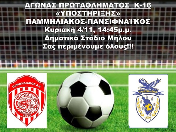 Την Κυριακή 4 Νοεμβρίου στις 14.45 μ.μ στο Στάδιο Μήλου θα πραγματοποιηθεί ο ποδοσφαιρικός αγώνας μεταξύ Παμμηλιακού και Πανσηφναϊκού.
