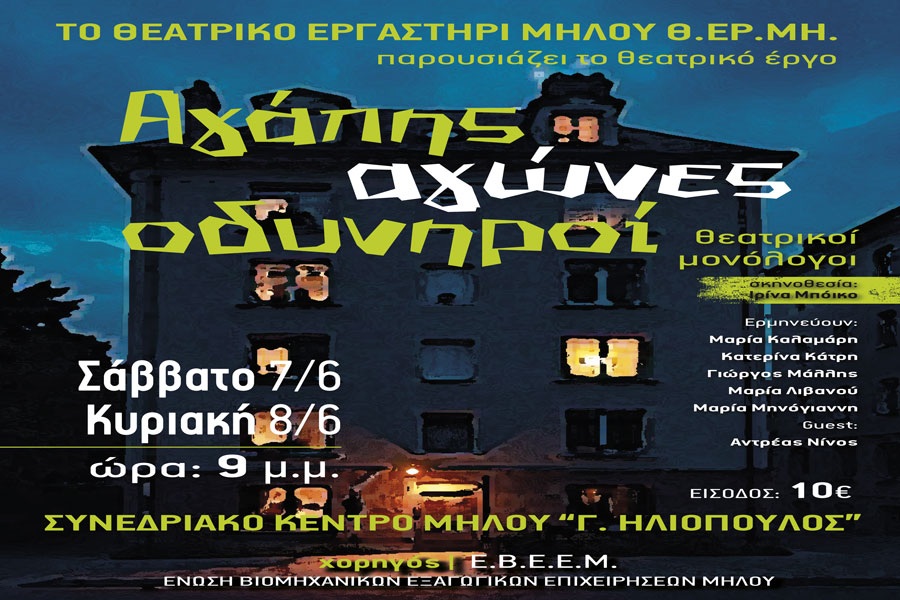 Το Θεατρικό Εργαστήρι Μήλου (ΘΕ.Ρ.ΜΗ) παρουσιάζει την παράσταση “ΑΓΑΠΗΣ ΑΓΩΝΕΣ ΟΔΥΝΗΡΟΙ” σε σκηνοθεσία της Ιρίνα Μπόικο.