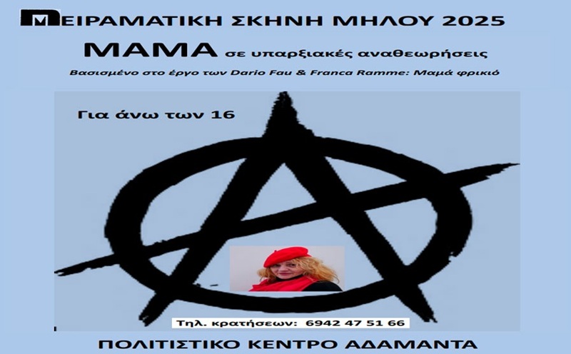 Η Πειραματική Σχολή Μήλου ανεβάζει την Παρασκευή 29, Σάββατο 30 και Κυριακή 31 Αυγούστου, στις 21.00 στο Πολιτιστικό Κέντρο Αδάμαντα την παράσταση ¨ΜΑΜΑ σε υπαρξιακές αναθεωρήσεις¨ βασισμένο στο έργο ¨Μαμά φρικιό¨ του Ντάριο Φο.