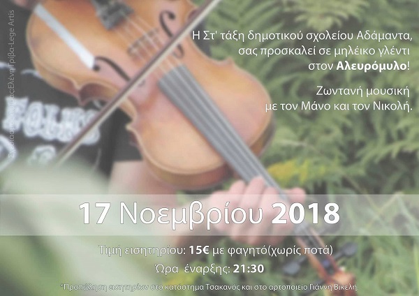 Η ΣΤ΄τάξη του Δημοτικού σχολείου Αδάμαντα διοργανώνει το Σάββατο 17 Νοεμβρίου 2018 Μηλέϊκο γλέντι στο εστιατόριο “Αλευρόμυλος” στις 21.30 , με ζωντανή μουσική με τους Μάνο και Νικολή.