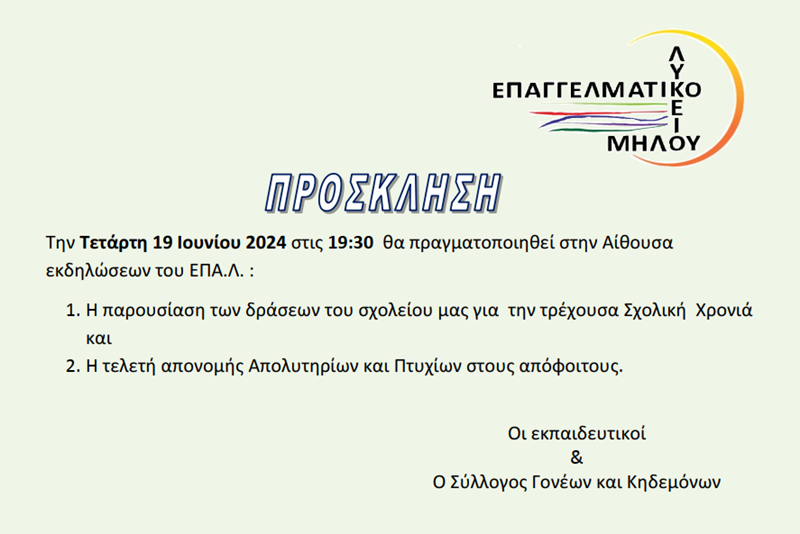 Πρόσκληση για την αποφοίτηση των μαθητών του ΕΠΑ.Λ Μήλου.