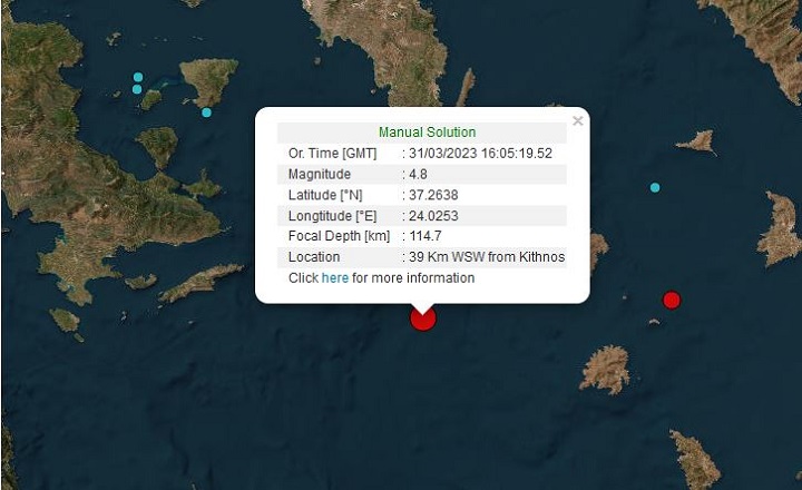 Tο επίκεντρο του σεισμού εντοπίζεται στα 39 χιλιόμετρα δυτικά, νοτιοδυτικά της Κύθνου, σύμφωνα με την αναθεωρημένη λύση του Γεωδυναμικού Ινστιτούτου Αθηνών. Το εστιακό βάθος του σεισμού εκτιμάται στα 114,7 χιλιόμετρα.