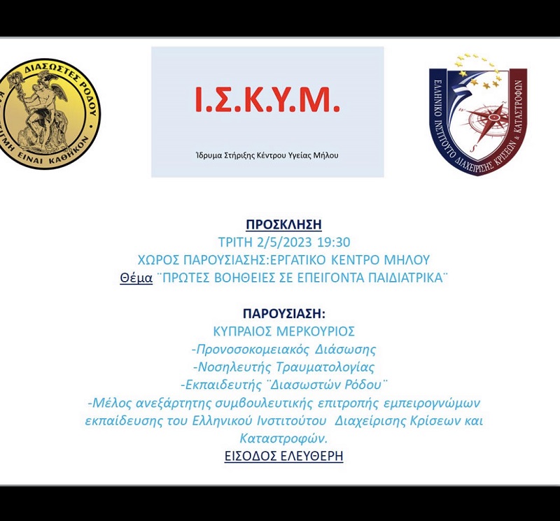 Το Ίδρυμα Στήριξης Κέντρου Υγείας Μήλου διοργανώνει ενημερωτικό σεμινάριο με τον βραβευμένο μηλιό διασώστη Μερκούρη Κυπραίο με θέμα “Πρώτες βοήθειες σε επείγοντα παιδιατρικά” την Τρίτη 2 Μαίου στις 19.30 στο Εργατικό Κέντρο Μήλου.