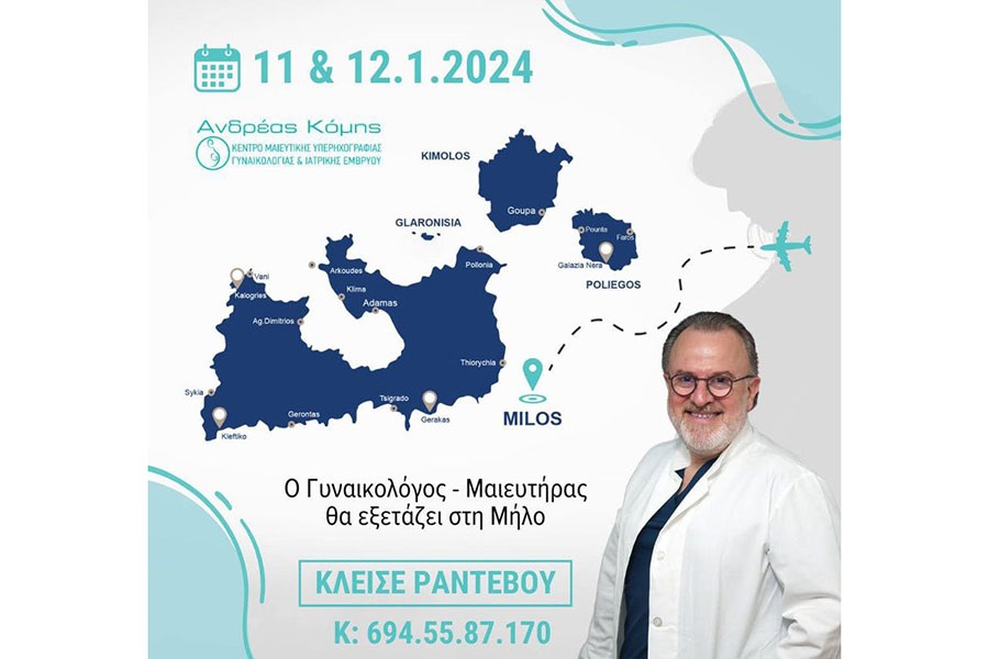 Ο Γυναικολόγος-Μαιευτήρας Ανδρέας Κόμης θα εξετάζει στη Μήλο την Πέμπτη 11 και την Παρασκευή 12 Ιανουαρίου 2024.