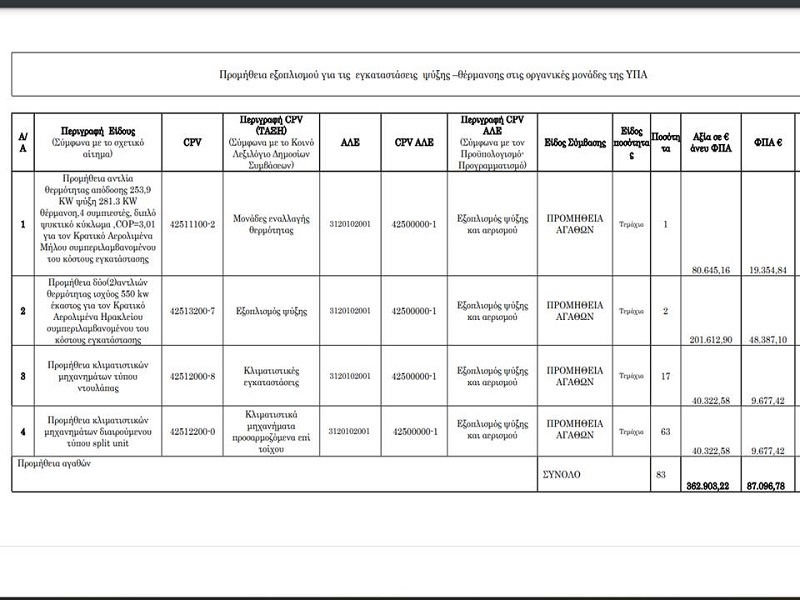 Εγκρίθηκε η διαδικασία σύναψης δημόσιας σύμβασης για την προμήθεια υλικών ανταλλακτικών για τις εγκαταστάσεις ψύξης–θέρμανσης της ΥΠΑ συνολικού ποσού 450.000,00 € (Tετρακοσίων πενήντα χιλιάδων ευρώ).