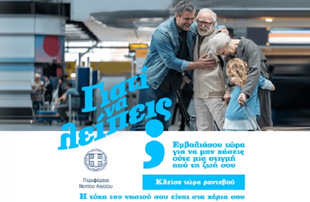 Για την καμπάνια «Γιατί να λείπεις από τη ζωή σου; Η τύχη του νησιού σου είναι στο χέρι σου», η Περιφέρεια Νοτίου Αιγαίου συνεργάστηκε με την εταιρεία «MullenLowe Επικοινωνίες» του παγκόσμιου ομίλου McCann, η οποία έφερε εις πέρας το σχεδιασμό και παραγωγή της μέσα σε πολύ στενά χρονικά περιθώρια. Θα βρίσκεται στον αέρα (τηλεόραση, ραδιόφωνο, ψηφιακά μέσα) για τουλάχιστον οκτώ εβδομάδες ως καμπάνια κοινωνικού μηνύματος.